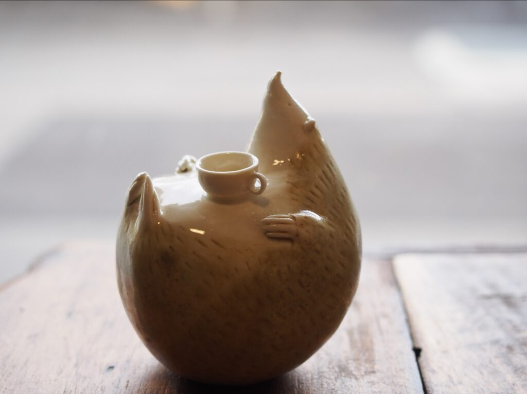 私が陶芸を学んだ、工芸学校 Capellagården があるスウェーデンの南、Öland 島の田舎町で 素朴ながら豊かに暮らす人々から、syjunta という言葉を教わりました。気の置けない友人同士が集い、編み物や刺繍などをしながらお茶やおしゃべりの時間を楽しむという文化があるそうです。そんな彼らの為人を表すような週末のたのしみを、ある日 、粘土でやってみようよと友人に誘われ 学生寮のキッチンで生まれたのがこの動物シリーズです。土をこねて丸めて手足を伸ばして、お団子のようにしてつくった動物たちは、誰かの手に渡るとまた新たな物語が生まれることもありました。初めてつくった犬はルームメイトが愛犬パックスの分身だと喜んでくれました。ライオンは、友人が 髭もじゃで彼氏にそっくりだと笑い、きっとストックホルム生まれよ! と、故郷が決まりました。小さな一輪挿しは、腰をかがめ畑を世話した亡き祖母を想ってつくったものですが、家族思いの少年がお母さんへのクリスマスプレゼントにと一つ買ってくれました。